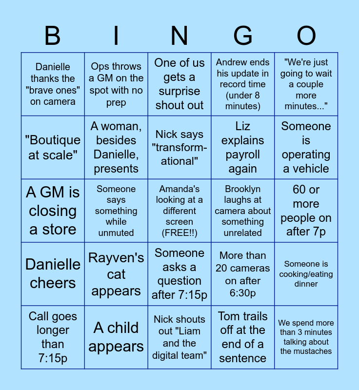 This bingo card has a free space and 24 words: Rayven's cat appears, A child appears, Nick says "transform-ational", Call goes longer than 7:15p, "We're just going to wait a couple more minutes...", Danielle thanks the "brave ones" on camera, "Boutique at scale", Ops throws a GM on the spot with no prep, Brooklyn laughs at camera about something unrelated, Someone asks a question after 7:15p, Liz explains payroll again, A GM is closing a store, More than 20 cameras on after 6:30p, Someone is cooking/eating dinner, A woman, besides Danielle, presents, Tom trails off at the end of a sentence, 60 or more people on after 7p, One of us gets a surprise shout out, Someone is operating a vehicle, Someone says something while unmuted, We spend more than 3 minutes talking about the mustaches, Danielle cheers, Andrew ends his update in record time (under 8 minutes) and Nick shouts out "Liam and the digital team".