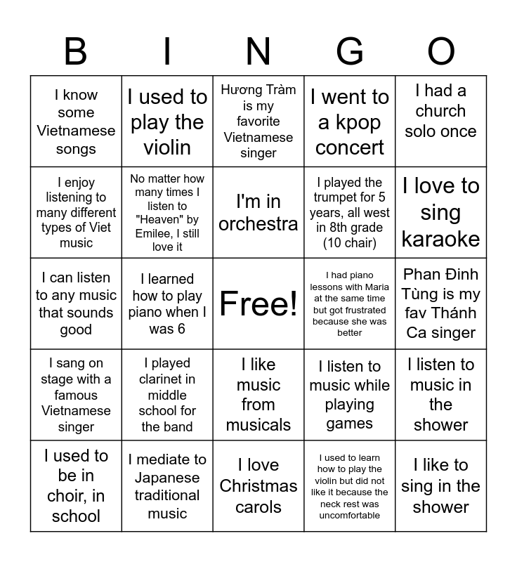 This bingo card has a free space and 24 words: I played clarinet in middle school for the band, I mediate to Japanese traditional music, I'm in orchestra, I used to be in choir, in school, I had a church solo once, I know some Vietnamese songs, I enjoy listening to many different types of Viet music, I used to play the violin, I had piano lessons with Maria at the same time but got frustrated because she was better, I like music from musicals, I played the trumpet for 5 years, all west in 8th grade (10 chair), I can listen to any music that sounds good, I listen to music while playing games, I listen to music in the shower, No matter how many times I listen to "Heaven" by Emilee, I still love it, I used to learn how to play the violin but did not like it because the neck rest was uncomfortable, Phan Đinh Tùng is my fav Thánh Ca singer, Hương Tràm is my favorite Vietnamese singer, I love to sing karaoke, I learned how to play piano when I was 6, I like to sing in the shower, I sang on stage with a famous Vietnamese singer, I went to a kpop concert and I love Christmas carols.