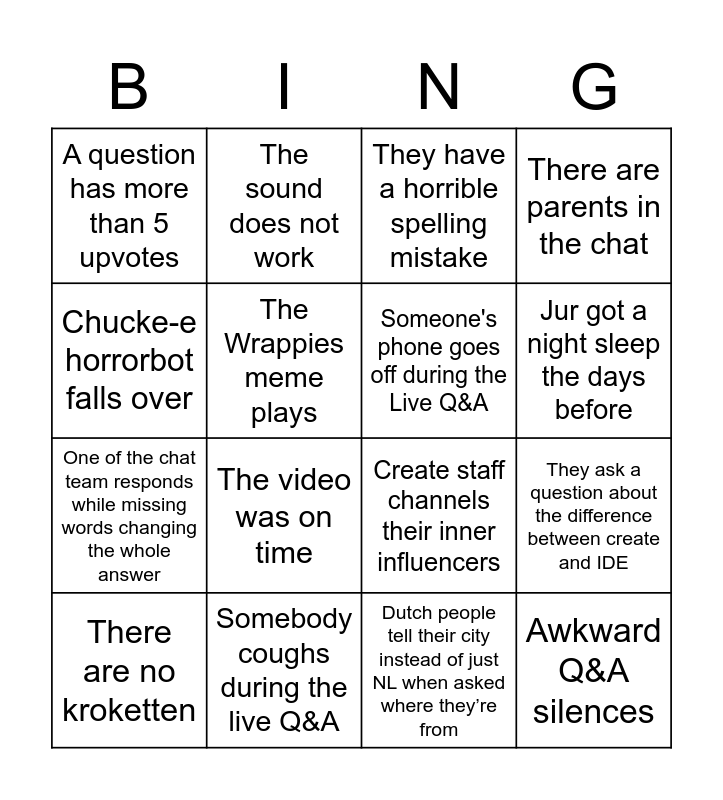 This bingo card has 16 words: Somebody coughs during the live Q&A, They ask a question about the difference between create and IDE, They have a horrible spelling mistake, A question has more than 5 upvotes, One of the chat team responds while missing words changing the whole answer, The sound does not work, Create staff channels their inner influencers, Dutch people tell their city instead of just NL when asked where they’re from, Chucke-e horrorbot falls over, The Wrappies meme plays, There are no kroketten, There are parents in the chat, The video was on time, Jur got a night sleep the days before, Someone's phone goes off during the Live Q&A and Awkward Q&A silences.