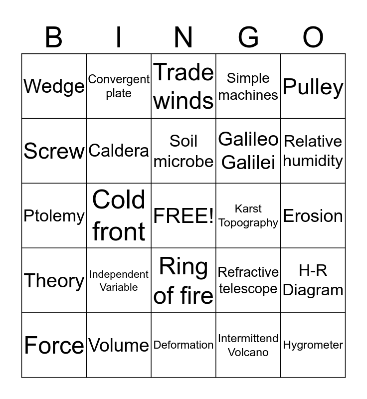 This bingo card has a free space and 24 words: Independent Variable, Volume, Soil microbe, Force, Pulley, Wedge, Screw, Convergent plate, Karst Topography, Ring of fire, Galileo Galilei, Ptolemy, Refractive telescope, H-R Diagram, Caldera, Intermittend Volcano, Erosion, Trade winds, Relative humidity, Cold front, Hygrometer, Theory, Simple machines and Deformation.