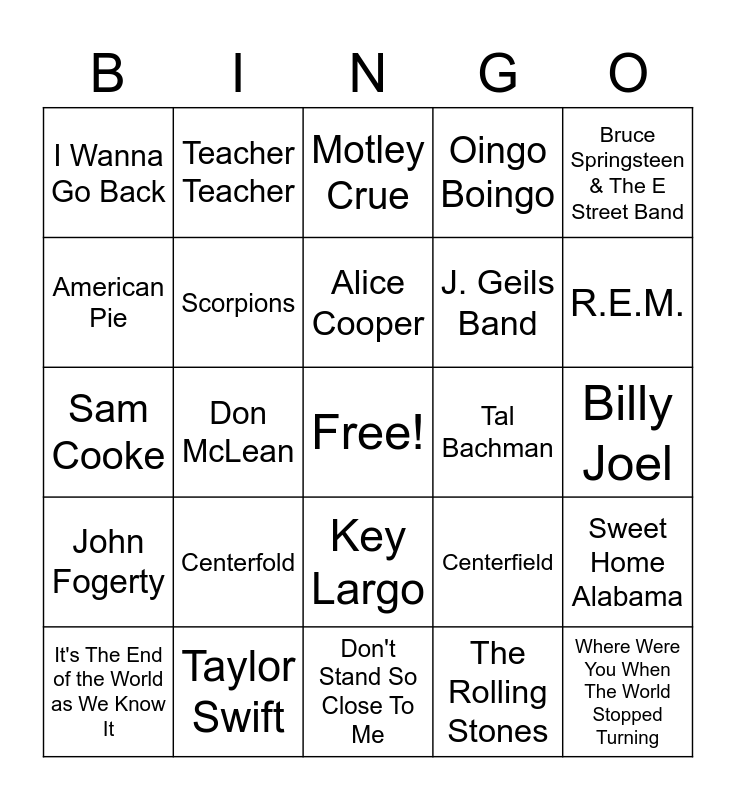 This bingo card has a free space and 68 words: Alan Jackson, Where Were You When The World Stopped Turning, Herman's Hermit, Henry VIII, LFO, Summer Girls, Teacher Teacher, School's Out, Alice Cooper, Bertie Higgins, Key Largo, We Didn't Start the Fire, Billy Joel, Bruce Springsteen & The E Street Band, Born in the U.S.A., American Pie, Don McLean, I Wanna Go Back, Eddie Money, Centerfold, J. Geils Band, Centerfield, John Fogerty, Bawitdaba, Kid Rock, Living Colour, Cult of Personality, Lynyrd Skynyrd, Sweet Home Alabama, Smokin' In The Boys Room, Motley Crue, Neil Young, Ohio, Weird Science, Oingo Boingo, Another Brick in the Wall, Pink Floyd, It's The End of the World as We Know It, R.E.M., Sam Cooke, Wonderful World, Wind of Change, Scorpions, Simon & Garfunkel, Kodachrome, Story of My Life, Social Distortion, She's So High, Tal Bachman, Taylor Swift, Fifteen, ABC, Jackson 5, Don't Stand So Close To Me, The Police, Sympathy for the Devil, The Rolling Stones, Thomas Dolby, She Blinded Me With Science, Timbuk 3, The Futures So Bright, U2, Pride (In The Name of Love), Van Halen, Hot For Teacher, Teenage Dirtbag, Wheatus and .38 Special.