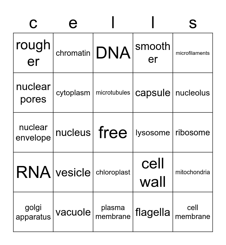 This bingo card has a free space and 24 words: vesicle, vacuole, microtubules, golgi apparatus, microfilaments, rough er, nuclear pores, chromatin, lysosome, chloroplast, capsule, nuclear envelope, cell wall, mitochondria, cytoplasm, flagella, ribosome, DNA, nucleolus, nucleus, cell membrane, RNA, smooth er and plasma membrane.