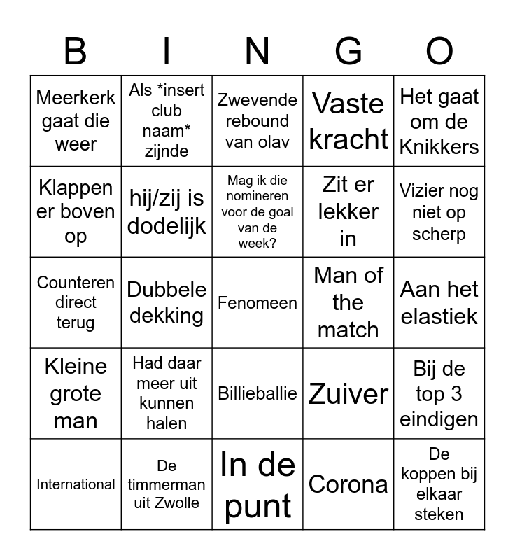 This bingo card has 25 words: Kleine grote man, De timmerman uit Zwolle, Fenomeen, Corona, Het gaat om de Knikkers, Meerkerk gaat die weer, Als *insert club naam* zijnde, Zwevende rebound van olav, Man of the match, Bij de top 3 eindigen, Klappen er boven op, hij/zij is dodelijk, In de punt, Zuiver, Vizier nog niet op scherp, International, Dubbele dekking, Mag ik die nomineren voor de goal van de week?, Zit er lekker in, Aan het elastiek, Counteren direct terug, Had daar meer uit kunnen halen, Billieballie, Vaste kracht and De koppen bij elkaar steken.