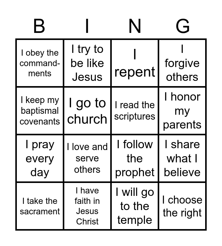 This bingo card has 16 words: I have faith in Jesus Christ, I share what I believe, I repent, I obey the command- ments, I pray every day, I try to be like Jesus, I follow the prophet, I will go to the temple, I keep my baptismal covenants, I go to church, I take the sacrament, I forgive others, I love and serve others, I honor my parents, I read the scriptures and I choose the right.