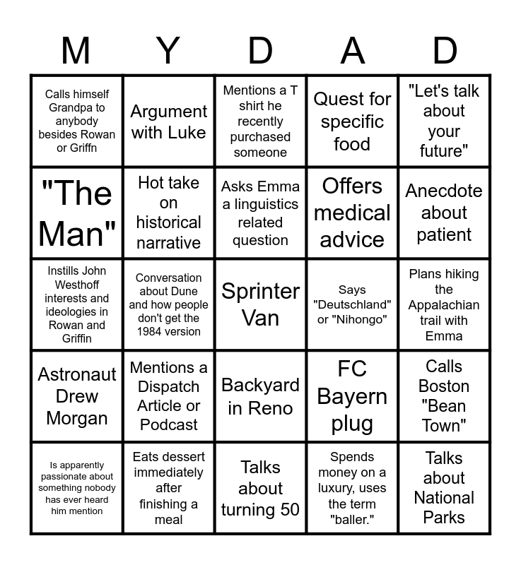 This bingo card has a free space and 24 words: Mentions a Dispatch Article or Podcast, Eats dessert immediately after finishing a meal, Asks Emma a linguistics related question, Is apparently passionate about something nobody has ever heard him mention, "Let's talk about your future", Calls himself Grandpa to anybody besides Rowan or Griffn, "The Man", Argument with Luke, Says "Deutschland" or "Nihongo", Backyard in Reno, Offers medical advice, Instills John Westhoff interests and ideologies in Rowan and Griffin, FC Bayern plug, Calls Boston "Bean Town", Hot take on historical narrative, Spends money on a luxury, uses the term "baller.", Plans hiking the Appalachian trail with Emma, Mentions a T shirt he recently purchased someone, Anecdote about patient, Conversation about Dune and how people don't get the 1984 version, Talks about National Parks, Astronaut Drew Morgan, Quest for specific food and Talks about turning 50.