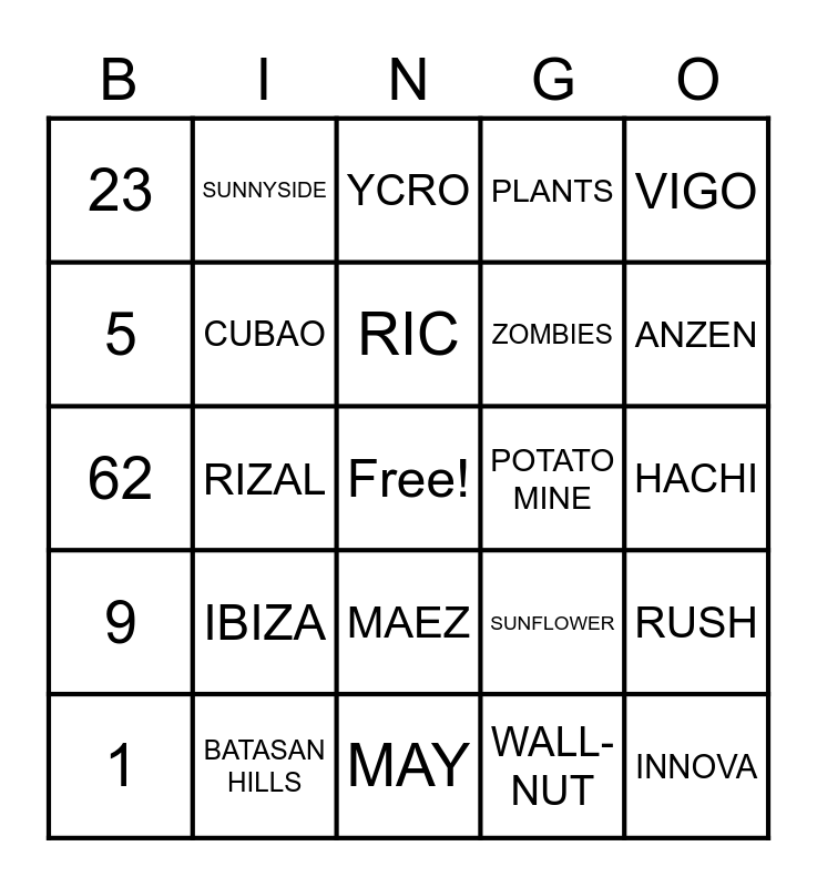 This bingo card has a free space and 24 words: 1, IBIZA, RIC, WALL-NUT, VIGO, 23, SUNNYSIDE, YCRO, POTATO MINE, HACHI, 62, CUBAO, SUNFLOWER, RUSH, 5, BATASAN HILLS, MAY, PLANTS, ANZEN, 9, RIZAL, MAEZ, ZOMBIES and INNOVA.