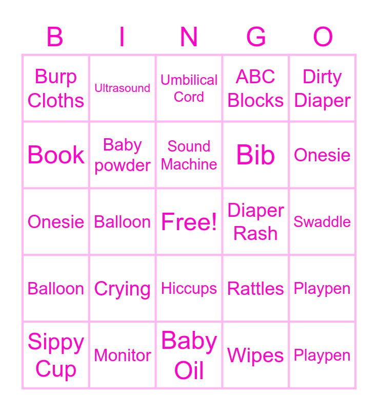 ⚠ This card has duplicate items: Book (2), Pacifier (3), Dirty Diaper (2), Crib (2), Bath Tub (2), Stuffed Animal (2), Pack n’ play (2), Blanket (2), Diaper Cream (2), Baby powder (2), Lullaby (2), Diaper (2), Footprint (2), Bib (2), Button (2), Balloon (2), Monitor (2), Toy Box (2), Rubber Duck (2), Rocking Chair (2), Burp Cloths (2), Nursery (2), Sound Machine (2), Onesie (2), ABC Blocks (2), Crying (2), Cooing (2), High Chair (2), Ultrasound (2), Umbilical Cord (2), Diaper Rash (2), Diaper Bag (2), Stroller (2), Hiccups (2), Swaddle (2), Booties (2), Wipes (2), Baby Oil (2), Rattles (2), Sippy Cup (2), Formula (2), Bouncer (2), Walker (2), Playpen (2), Car seat (2), Blowout (2), Fussy (2), Spit Up (2), Baby Gate (2)