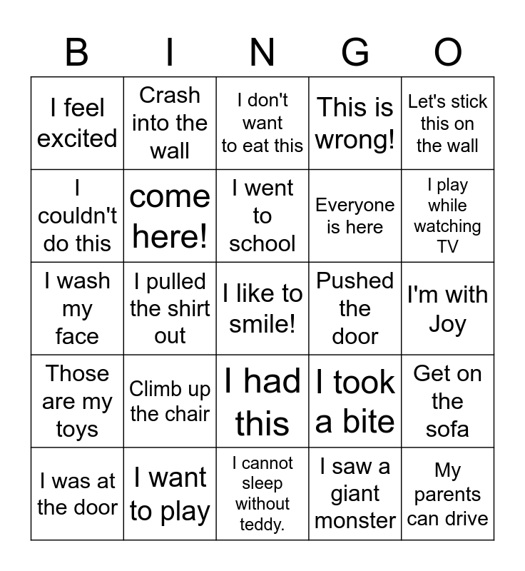 This bingo card has a free space and 24 words: Climb up the chair, I want to play, I went to school, I was at the door, Let's stick this on the wall, I feel excited, I couldn't do this, Crash into the wall, Pushed the door, I had this, Everyone is here, I wash my face, I took a bite, Get on the sofa, come here!, I saw a giant monster, I'm with Joy, I don't want to eat this, I play while watching TV, I pulled the shirt out, My parents can drive, Those are my toys, This is wrong! and I cannot sleep without teddy..