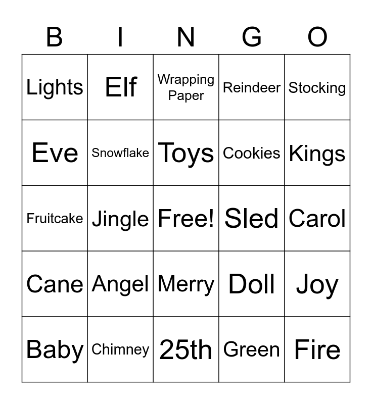 This bingo card has a free space and 64 words: Santa, Holly, Snow, Joy, Star, Bells, Elf, Noel, Toys, Tree, Merry, Frosty, Carol, Stocking, Present, Eve, Jingle, Lights, Milk, Cookies, Angel, Cane, Reindeer, Cider, Xmas, Winter, Gift, Jolly, Wreath, Cupid, Pie, Tinsel, Pine, Happy, Kings, Baby, Wish, Green, Red, Snowflake, Fruitcake, Sled, Rudolph, Deer, Punch, Fire, Chimney, Candle, Doll, Greetings, Holiday, December, 25th, Scarf, Sledding, Decorating, Wrapping Paper, Love, Singing, Mrs. Claus, Hot Cocoa, Bright, Candy and Mistletoe.
