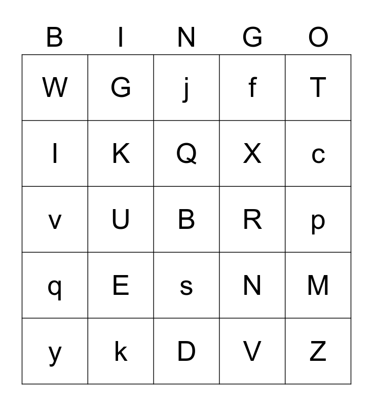 This bingo card has 52 words: A, B, C, D, E, F, G, H, I, J, K, L, M, N, O, P, Q, R, S, T, U, V, W, X, Y, Z, a, b, c, d, e, f, g, h, i, j, k, l, m, n, o, p, q, r, s, t, u, v, w, x, y and z.