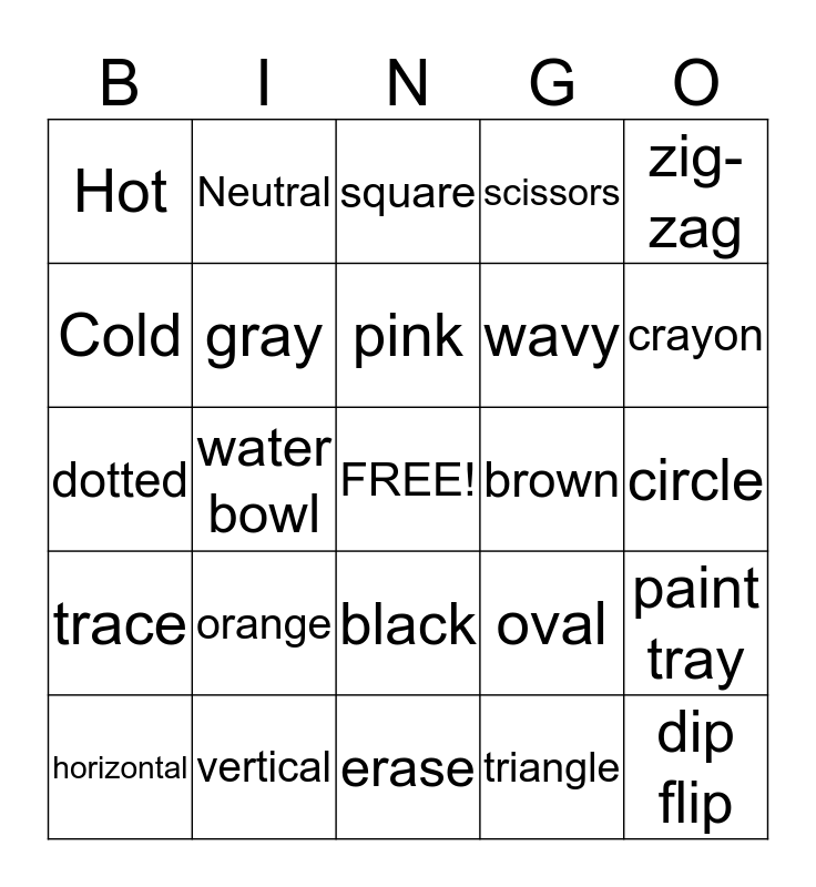 This bingo card has a free space and 24 words: orange, vertical, pink, horizontal, zig-zag, Hot, Cold, Neutral, brown, black, wavy, dotted, oval, paint tray, gray, triangle, circle, square, crayon, water bowl, dip flip, trace, scissors and erase.