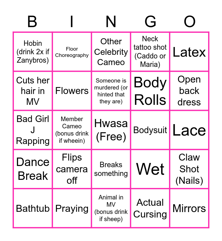 This bingo card has a free space and 24 words: Bathtub, Flips camera off, Someone is murdered (or hinted that they are), Actual Cursing, Latex, Hobin (drink 2x if Zanybros), Floor Choreography, Other Celebrity Cameo, Bodysuit, Lace, Bad Girl J Rapping, Flowers, Wet, Claw Shot (Nails), Cuts her hair in MV, Praying, Animal in MV (bonus drink if sheep), Neck tattoo shot (Caddo or Maria), Open back dress, Dance Break, Member Cameo (bonus drink if wheein), Breaks something, Body Rolls and Mirrors.