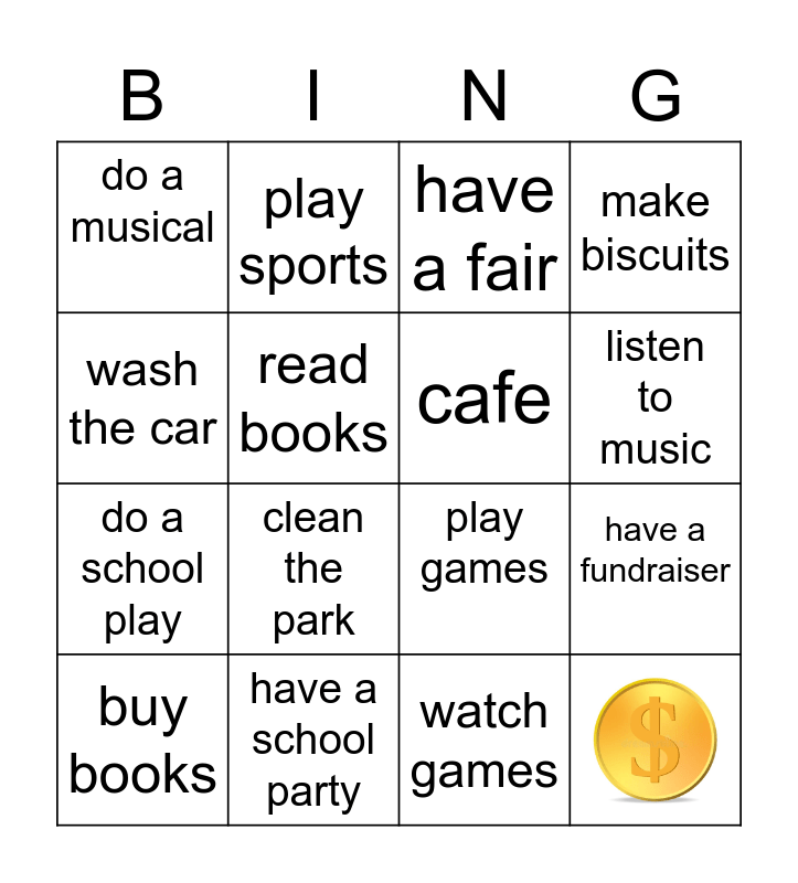 This bingo card has 1 images and 15 words: have a school party, have a fundraiser, have a fair, do a musical, do a school play, play sports, play games, watch games, wash the car, read books, buy books, make biscuits, clean the park, listen to music and cafe.
