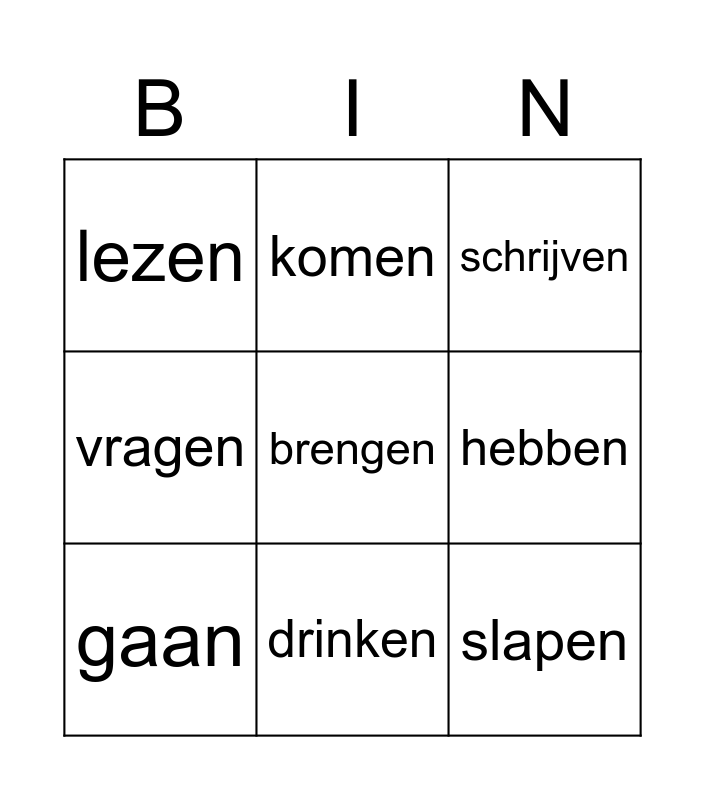 This bingo card has 21 words: Free!, beginnen, komen, kopen, geven, gaan, lezen, schrijven, eten, drinken, slapen, vragen, zoeken, zijn, hebben, weten, spreken, lopen, brengen, doen and krijgen.