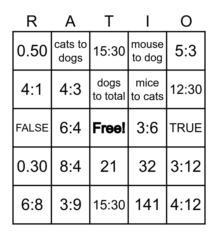 This bingo card has a free space and 24 words: 6:8, 8:4, dogs to total, 141, 5:3, 0.50, cats to dogs, 15:30, 3:6, TRUE, FALSE, 4:3, 32, 3:12, 4:1, 3:9, 15:30, mouse to dog, 12:30, 0.30, 6:4, 21, mice to cats and 4:12.