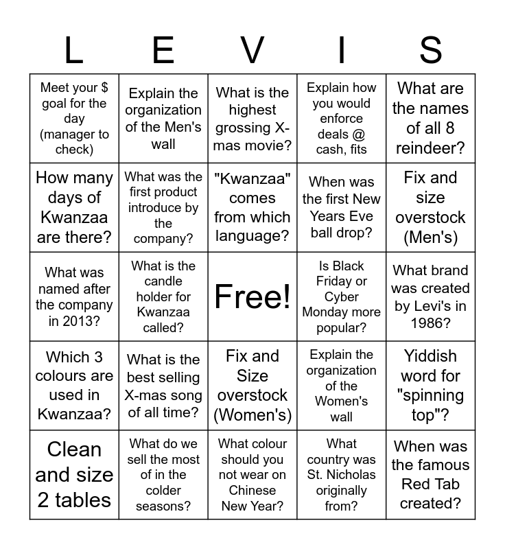 This bingo card has a free space and 24 words: What is the best selling X-mas song of all time?, What do we sell the most of in the colder seasons?, "Kwanzaa" comes from which language?, Clean and size 2 tables, What are the names of all 8 reindeer?, Meet your $ goal for the day (manager to check), How many days of Kwanzaa are there?, Explain the organization of the Men's wall, Is Black Friday or Cyber Monday more popular?, Fix and Size overstock (Women's), When was the first New Years Eve ball drop?, What was named after the company in 2013?, Explain the organization of the Women's wall, Yiddish word for "spinning top"?, What was the first product introduce by the company?, What country was St. Nicholas originally from?, What brand was created by Levi's in 1986?, What is the highest grossing X-mas movie?, Fix and size overstock (Men's), What is the candle holder for Kwanzaa called?, When was the famous Red Tab created?, Which 3 colours are used in Kwanzaa?, Explain how you would enforce deals @ cash, fits and What colour should you not wear on Chinese New Year?.