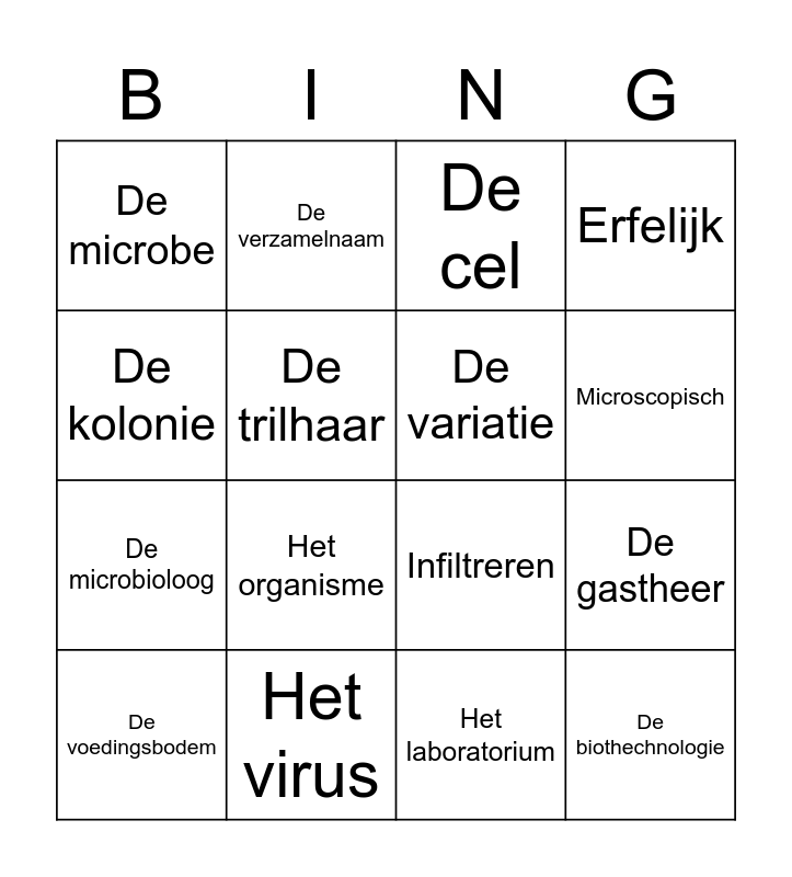This bingo card has 19 words: Infiltreren, Klonen, De cel, De biothechnologie, De gastheer, De kolonie, Het laboratorium, De microbe, De verzamelnaam, De microbioloog, Het organisme, De trilhaar, De variatie, Het virus, De voedingsbodem, Eencellig, Erfelijk, Microscopisch and Spiraalvormig.