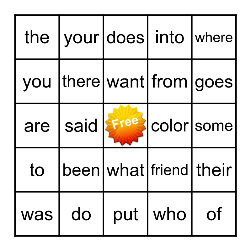 This bingo card has a free space and 25 words: been, put, want, was, where, the, you, your, color, what, from, are, friend, their, there, come, some, does, goes, said, of, do, to, into and who.