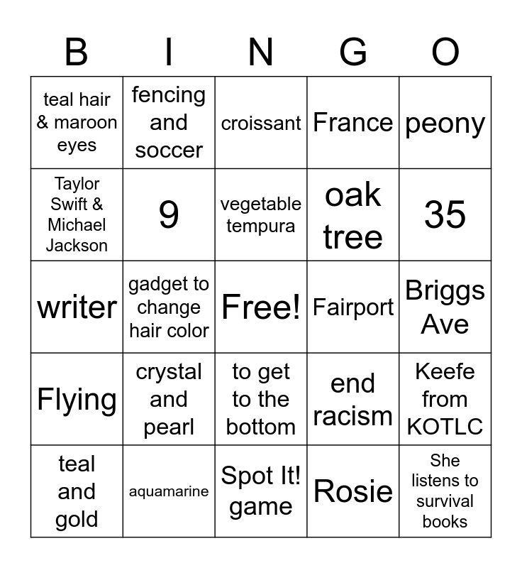 This bingo card has a free space and 34 words: dolphin, Rosie, Keeper of the Lost Cities, Memere and Tutu, Flying, 9, peony, teal and gold, fencing and soccer, Kauai, vegetable tempura, croissant, Rufus and Moonlight, Marshall, Fairport, 35, aquamarine, writer, crystal and pearl, end racism, to get to the bottom, piano, teal hair & maroon eyes, Briggs Ave, Spot It! game, She listens to survival books, France, Cretaceous, oak tree, Taylor Swift & Michael Jackson, Neptune, gadget to change hair color, Keefe from KOTLC and Mom let's her have makeup now.