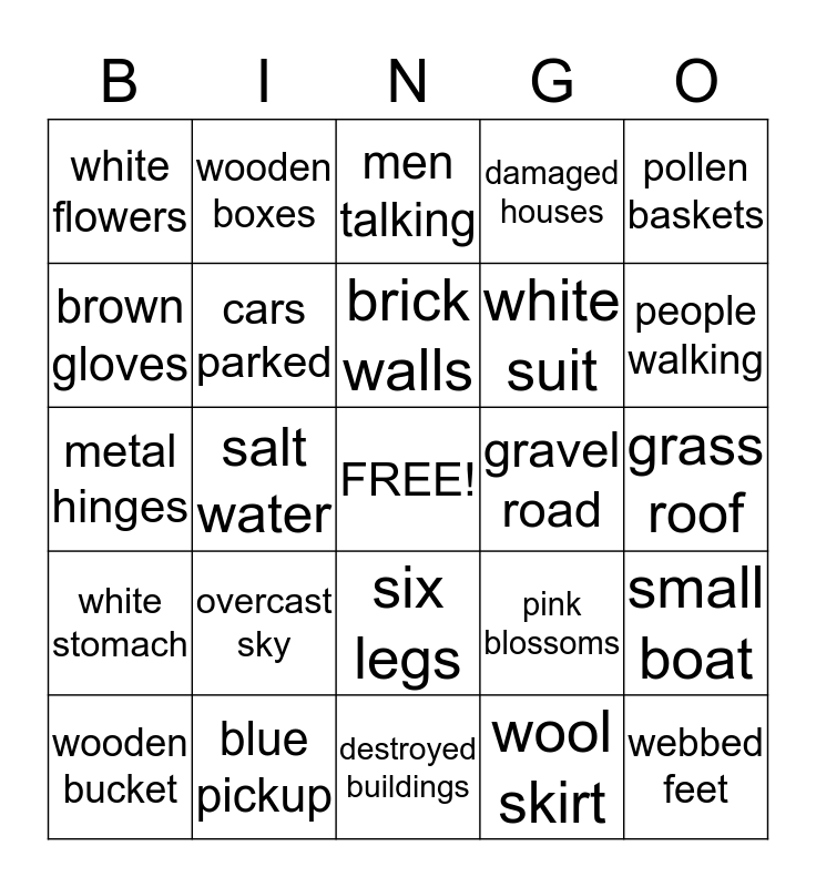 This bingo card has a free space and 24 words: overcast sky, blue pickup, brick walls, wooden bucket, pollen baskets, white flowers, brown gloves, wooden boxes, gravel road, six legs, white suit, metal hinges, pink blossoms, small boat, cars parked, wool skirt, grass roof, men talking, people walking, salt water, webbed feet, white stomach, damaged houses and destroyed buildings.