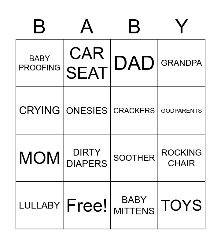 This bingo card has 28 words: MILK BOTTLE, CRYING, MOM, STROLLER, ONESIES, DAD, CAR SEAT, TOYS, Free!, GRANDMA, SOOTHER, GRANDPA, PRESENTS, BABY FOOD, DIRTY DIAPERS, BLANKIES, TEETHING, CRACKERS, GODPARENTS, NURSERY, BABY PROOFING, CRIB, LULLABY, ROCKING CHAIR, BABY MITTENS, DIAPERS, CRYING and COFFEE.