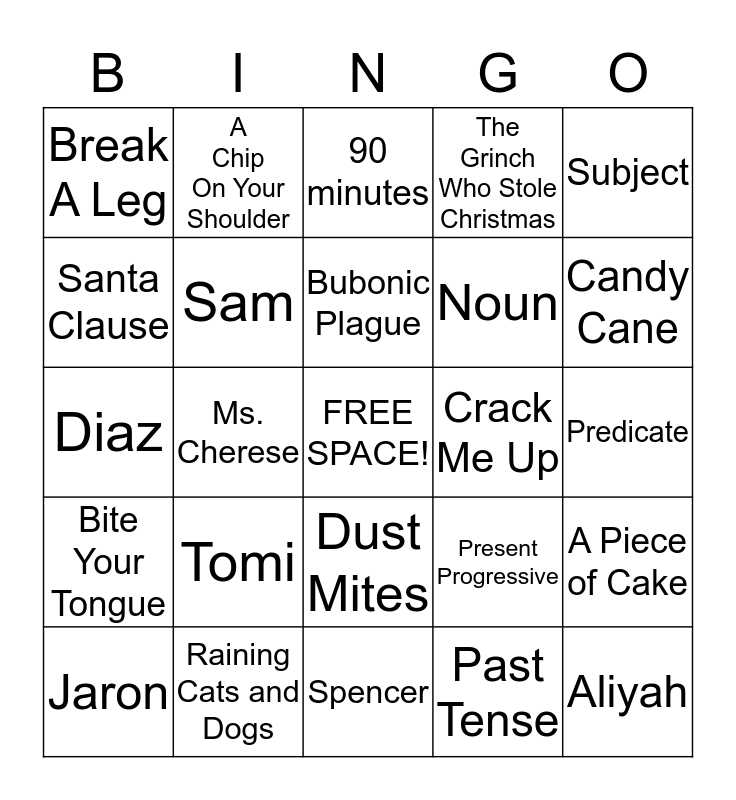 This bingo card has a free space and 24 words: Tomi, Raining Cats and Dogs, Bubonic Plague, Jaron, Subject, Break A Leg, Santa Clause, A Chip On Your Shoulder, Crack Me Up, Dust Mites, Noun, Diaz, Present Progressive, A Piece of Cake, Sam, Past Tense, Predicate, 90 minutes, Candy Cane, Ms. Cherese, Aliyah, Bite Your Tongue, The Grinch Who Stole Christmas and Spencer.