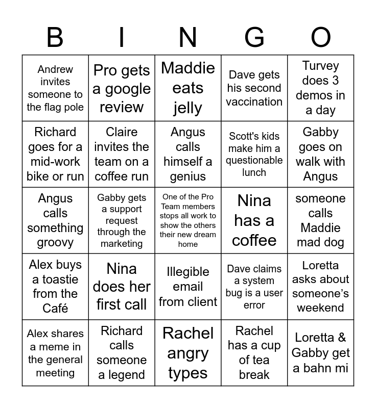 This bingo card has a free space and 24 words: Nina does her first call, Richard calls someone a legend, Angus calls himself a genius, Alex shares a meme in the general meeting, Turvey does 3 demos in a day, Andrew invites someone to the flag pole, Richard goes for a mid-work bike or run, Pro gets a google review, Nina has a coffee, Illegible email from client, Scott's kids make him a questionable lunch, Angus calls something groovy, Dave claims a system bug is a user error, Loretta asks about someone’s weekend, Claire invites the team on a coffee run, Rachel has a cup of tea break, someone calls Maddie mad dog, Maddie eats jelly, Gabby goes on walk with Angus, Gabby gets a support request through the marketing, Loretta & Gabby get a bahn mi, Alex buys a toastie from the Café, Dave gets his second vaccination and Rachel angry types.