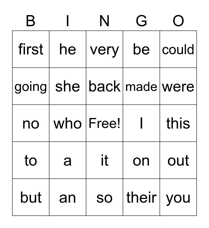 This bingo card has a free space and 24 words: a, an, back, but, could, first, going, he, I, it, made, no, on, out, she, their, this, very, were, who, you, to, be and so.