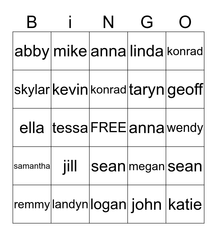 This bingo card has a free space and 31 words: logan, logan, tessa, julia, abby, anna, kevin, megan, anna, john, wendy, katie, marcus, steven, geoff, pam, sean, jill, samantha, sean, konrad, lena, remmy, mike, taryn, skylar, linda, ella, landyn, konrad and wendy.