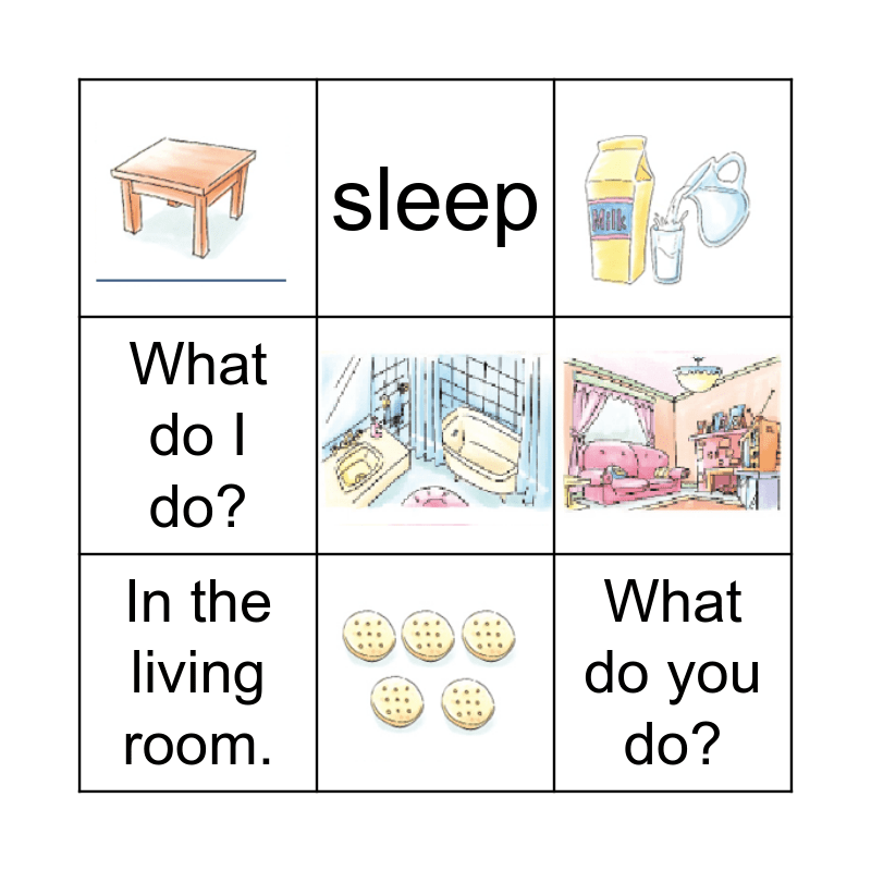 This bingo card has 9 images and 6 words: What do you do?, What does she do?, What do I do?, In the living room., sleep and watch tv.