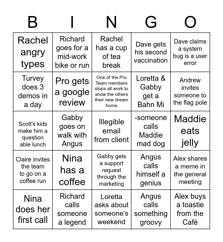 This bingo card has a free space and 24 words: Nina does her first call, Nina has a coffee, One of the Pro Team members stops all work to show the others their new dream home, Angus calls something groovy, Dave claims a system bug is a user error, Rachel angry types, Richard goes for a mid-work bike or run, Rachel has a cup of tea break, -someone calls Maddie mad dog, Maddie eats jelly, Scott's kids make him a question able lunch, Pro gets a google review, Angus calls himself a genius, Alex shares a meme in the general meeting, Turvey does 3 demos in a day, Richard calls someone a legend, Loretta asks about someone’s weekend, Dave gets his second vaccination, Andrew invites someone to the flag pole, Claire invites the team to go on a coffee run, Gabby goes on walk with Angus, Gabby gets a support request through the marketing, Loretta & Gabby get a Bahn Mi and Alex buys a toastie from the Café.