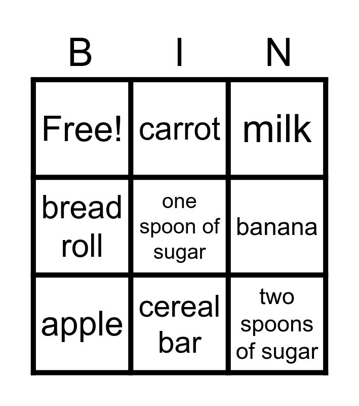 This bingo card has 9 words: apple, milk, carrot, bread roll, Free!, banana, one spoon of sugar, two spoons of sugar and cereal bar.