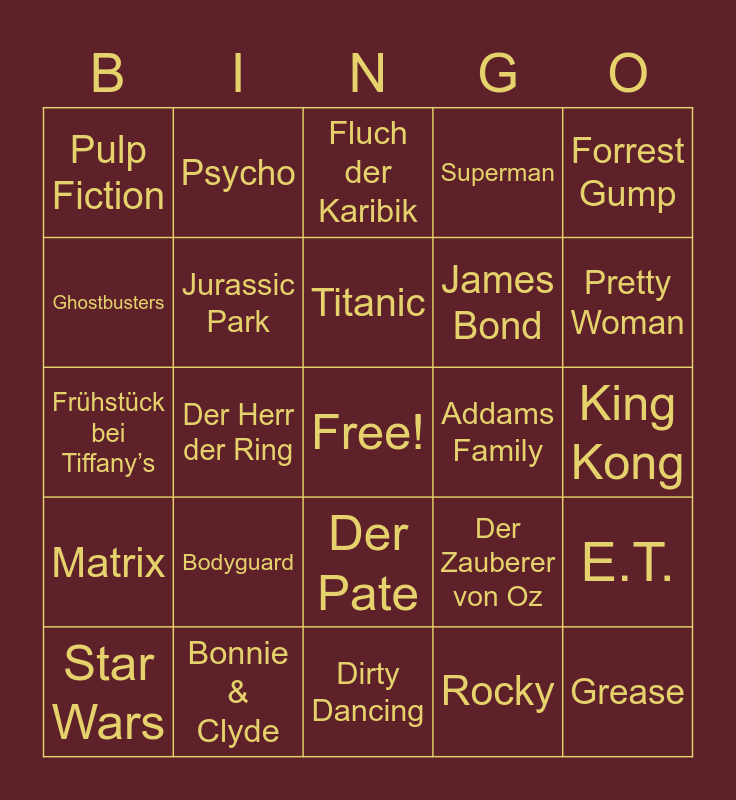 This bingo card has a free space and 26 words: Der Pate, Rocky, Titanic, Bonnie & Clyde, Forrest Gump, Pulp Fiction, Ghostbusters, Psycho, King Kong, Der Zauberer von Oz, James Bond, Frühstück bei Tiffany’s, E.T., Star Wars, Der Herr der Ring, Spider-Man, Superman, Matrix, Fluch der Karibik, Grease, Pretty Woman, Dirty Dancing, Addams Family, Bodyguard, Jurassic Park and Mamma Mia.