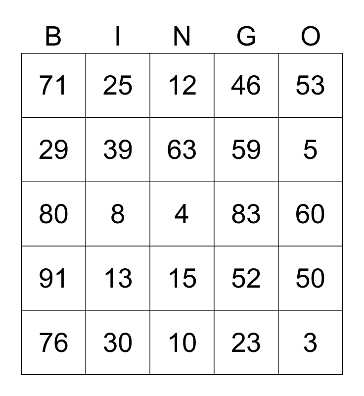 This bingo card has 50 words: 2, 4, 9, 10, 13, 22, 25, 28, 29, 32, 39, 46, 50, 52, 54, 55, 63, 83, 86, 53, 8, 23, 71, 59, 34, 3, 5, 7, 12, 15, 18, 19, 21, 24, 30, 35, 37, 38, 40, 60, 62, 65, 69, 72, 76, 80, 82, 85, 91 and 99.
