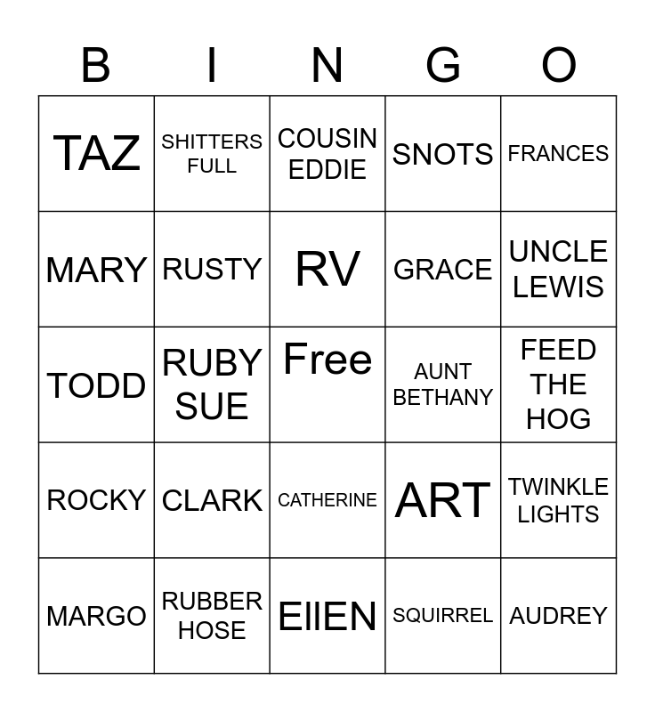 This bingo card has a free space and 24 words: CLARK, RUBBER HOSE, RV, MARGO, FRANCES, TAZ, MARY, SHITTERS FULL, AUNT BETHANY, CATHERINE, GRACE, TODD, ART, TWINKLE LIGHTS, RUSTY, SQUIRREL, FEED THE HOG, COUSIN EDDIE, UNCLE LEWIS, RUBY SUE, AUDREY, ROCKY, SNOTS and EllEN.