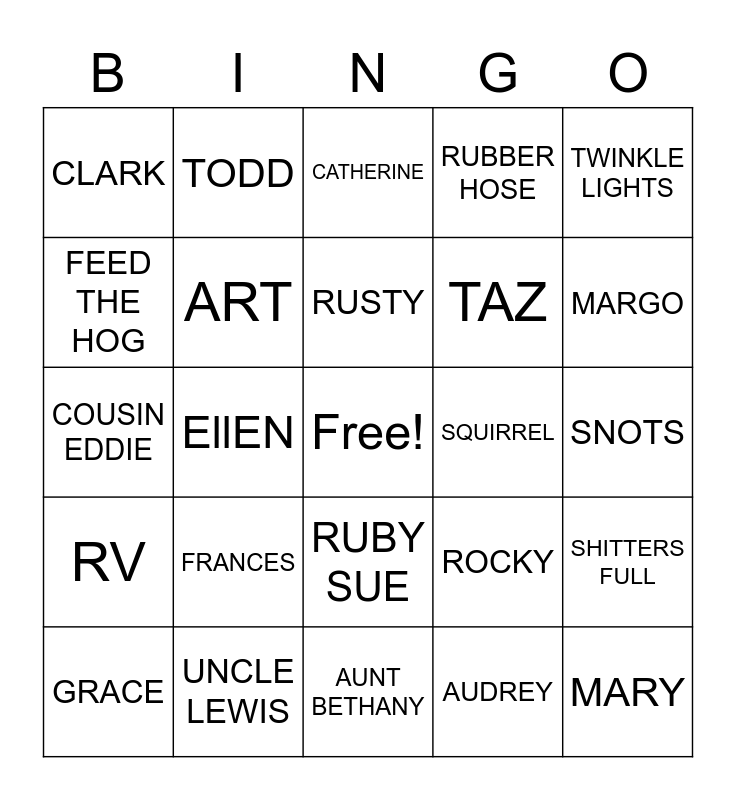 This bingo card has a free space and 24 words: FRANCES, UNCLE LEWIS, RUSTY, GRACE, TWINKLE LIGHTS, CLARK, FEED THE HOG, TODD, SQUIRREL, RUBY SUE, TAZ, COUSIN EDDIE, ROCKY, SHITTERS FULL, ART, AUDREY, SNOTS, CATHERINE, MARGO, EllEN, MARY, RV, RUBBER HOSE and AUNT BETHANY.