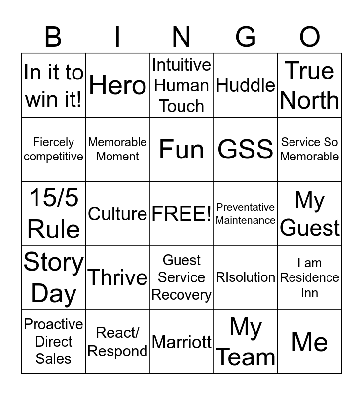 This bingo card has a free space and 24 words: Thrive, React/ Respond, Fun, Proactive Direct Sales, True North, In it to win it!, Fiercely competitive, Hero, Preventative Maintenance, Guest Service Recovery, GSS, 15/5 Rule, RIsolution, I am Residence Inn, Memorable Moment, My Team, My Guest, Intuitive Human Touch, Service So Memorable, Culture, Me, Story Day, Huddle and Marriott.