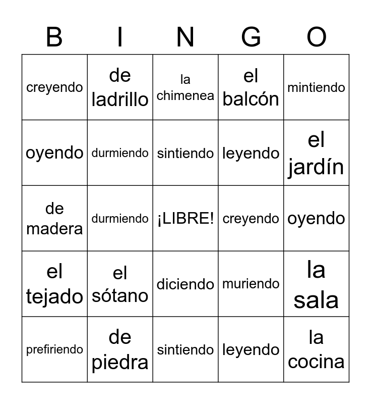 This bingo card has a free space and 31 words: sintiendo, sirviendo, durmiendo, muriendo, creyendo, la chimenea, durmiendo, muriendo, creyendo, leyendo, oyendo, la cocina, la despensa, el desván, el jardín, el pasillo, la sala, el sótano, el tejado, diciendo, mintiendo, pidiendo, prefiriendo, de ladrillo, leyendo, oyendo, el balcón, de madera, de piedra, sintiendo and sirviendo.