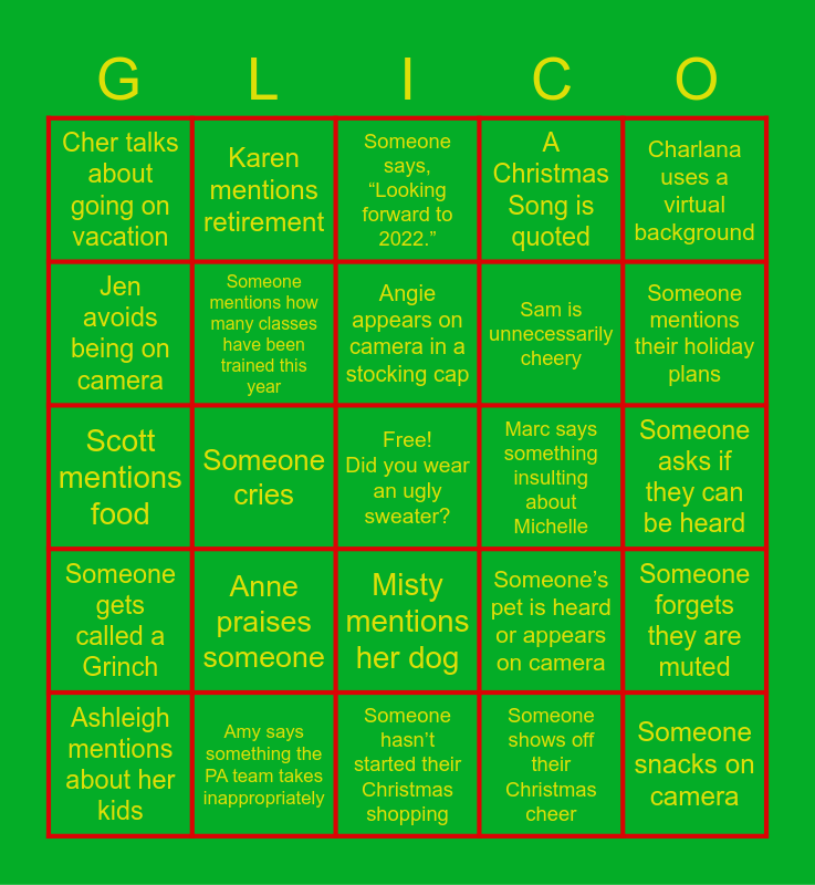 This bingo card has a free space and 24 words: Anne praises someone, Amy says something the PA team takes inappropriately, Angie appears on camera in a stocking cap, Ashleigh mentions about her kids, Charlana uses a virtual background, Cher talks about going on vacation, Jen avoids being on camera, Karen mentions retirement, Marc says something insulting about Michelle, Misty mentions her dog, Sam is unnecessarily cheery, Scott mentions food, Someone’s pet is heard or appears on camera, Someone forgets they are muted, Someone mentions how many classes have been trained this year, Someone shows off their Christmas cheer, Someone asks if they can be heard, Someone says, “Looking forward to 2022.”, Someone mentions their holiday plans, Someone cries, Someone snacks on camera, Someone gets called a Grinch, A Christmas Song is quoted and Someone hasn’t started their Christmas shopping.