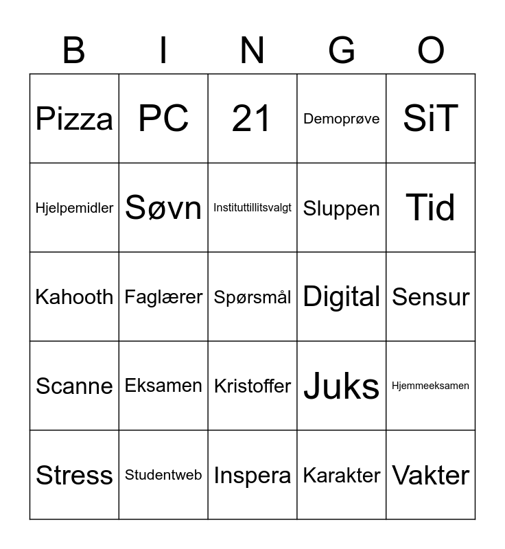 This bingo card has a free space and 24 words: Eksamen, Studentweb, Instituttillitsvalgt, Stress, SiT, Pizza, Hjelpemidler, PC, Digital, Kristoffer, Sluppen, Kahooth, Juks, Hjemmeeksamen, Søvn, Karakter, Sensur, 21, Tid, Faglærer, Vakter, Scanne, Demoprøve and Inspera.