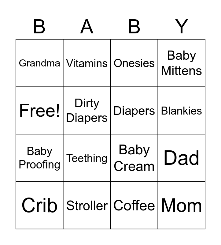 This bingo card has 36 words: Baby, Soother, Nap Time, Diapers, Baby Formula, Mom, Blankies, Car Seat, Free!, Milk Bottle, Dad, Baby Mittens, Grandpa, Stroller, Teething, Grandma, Sleepless Nights, Lullabies, Crib, Onesies, Coffee, Toys, Baby Gate, Breast Milk, Bib, Vitamins, Baby Cream, Baby Rash, Baby Proofing, Dirty Diapers, Baby Thermometer, Swaddlers, First Steps, Crying, Crawling and Godparents.