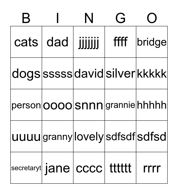 This bingo card has a free space and 24 words: granny, jane, david, secretaryt, bridge, cats, dogs, dad, grannie, lovely, silver, person, sdfsdf, sdfsd, sssss, tttttt, hhhhh, jjjjjjj, kkkkk, oooo, rrrr, uuuu, ffff and cccc.