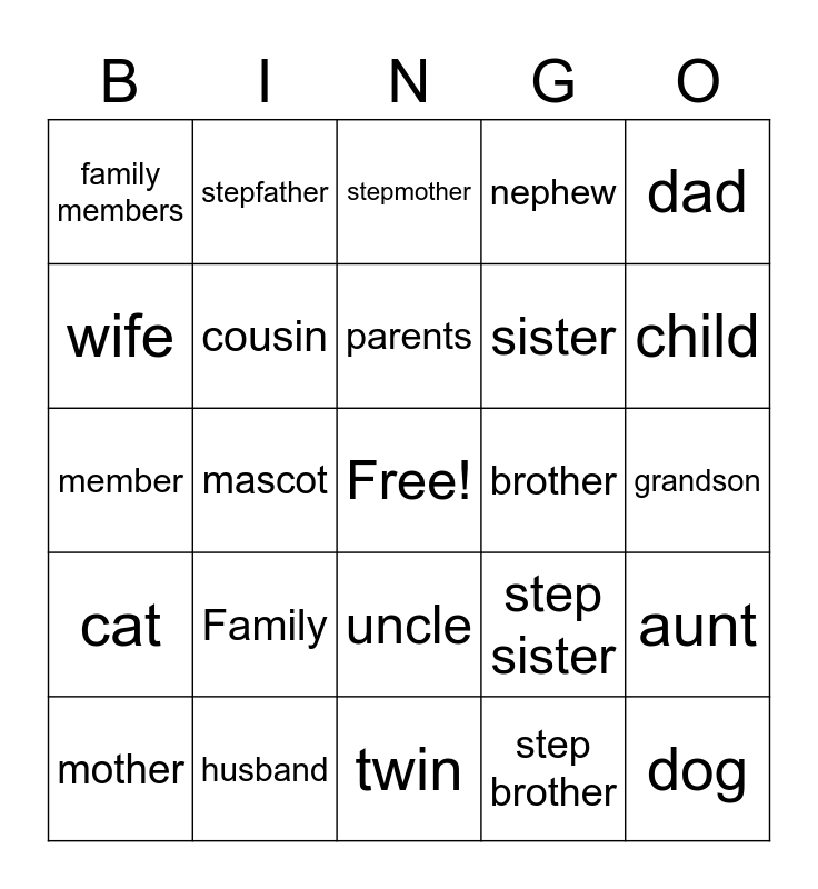 This bingo card has a free space and 24 words: Family, husband, parents, mother, dad, family members, wife, stepfather, brother, uncle, sister, member, step sister, aunt, cousin, step brother, grandson, stepmother, child, mascot, dog, cat, nephew and twin.