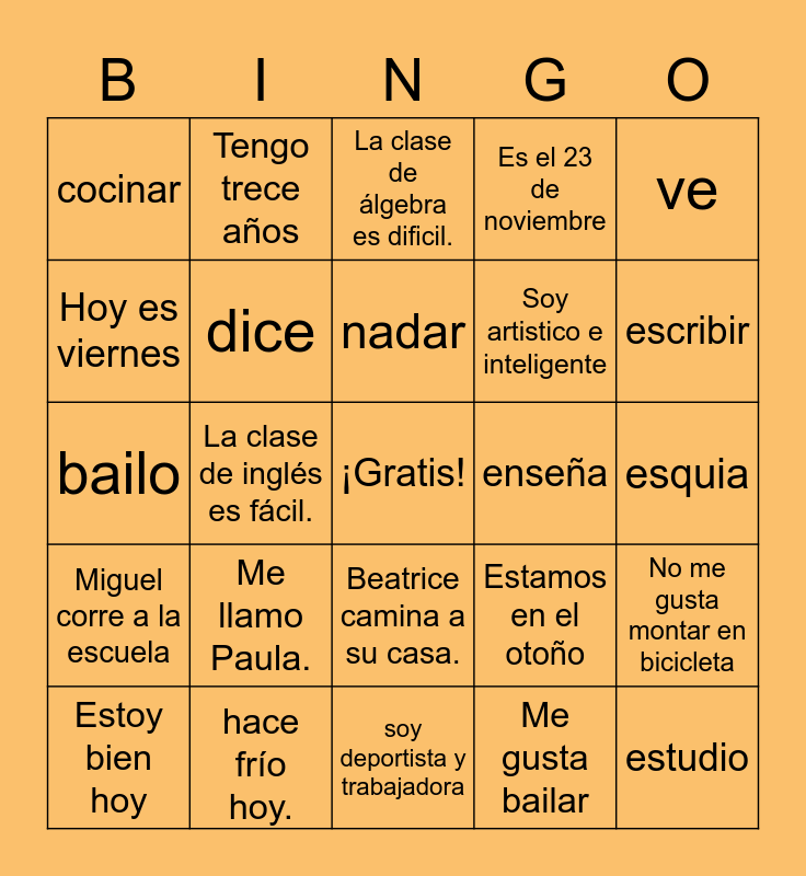 This bingo card has a free space and 24 words: Me llamo Paula., hace frío hoy., nadar, Estoy bien hoy, ve, cocinar, Hoy es viernes, Tengo trece años, enseña, Beatrice camina a su casa., Soy artistico e inteligente, bailo, Estamos en el otoño, No me gusta montar en bicicleta, dice, Me gusta bailar, esquia, La clase de álgebra es dificil., escribir, La clase de inglés es fácil., estudio, Miguel corre a la escuela, Es el 23 de noviembre and soy deportista y trabajadora.