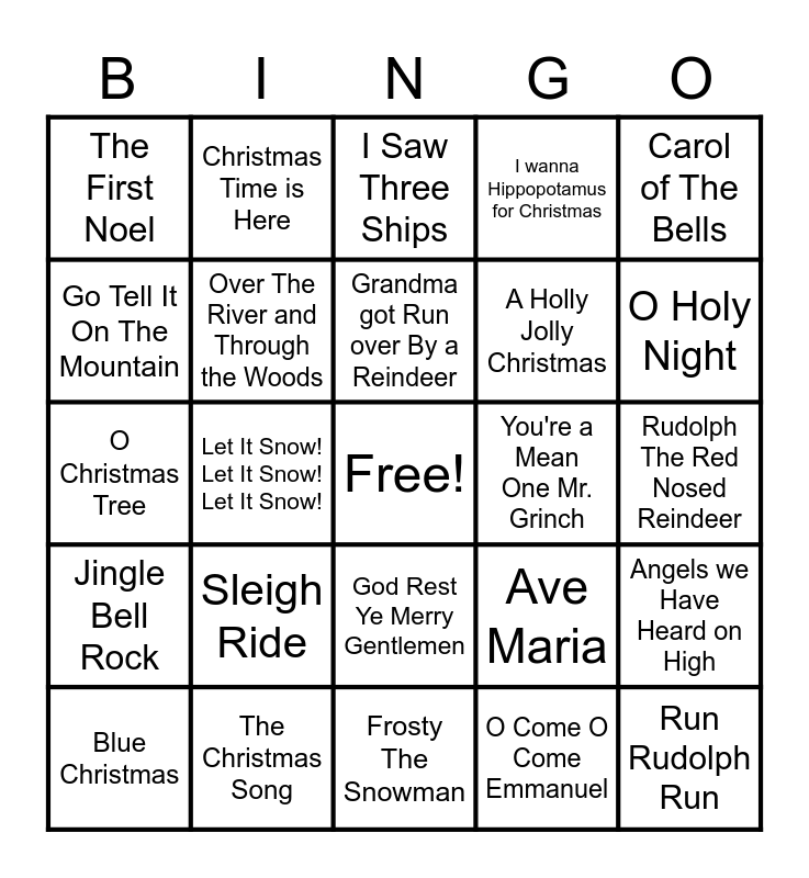 This bingo card has a free space and 44 words: Rockin' Around The Christmas Tree, Run Rudolph Run, Santa Claus is Comin' to Town, Blue Christmas, Silent Night, O Come O Come Emmanuel, I Saw Three Ships, Dance of The Sugar Plum Fairy, Carol of The Bells, The Christmas Song, I wanna Hippopotamus for Christmas, You're a Mean One Mr. Grinch, God Rest Ye Merry Gentlemen, Sleigh Ride, Jingle Bells, Frosty The Snowman, Away In A Manger, O Christmas Tree, O Come All Ye Faithful, O Holy Night, Christmas Time is Here, Little Drummer Boy, White Christmas, The First Noel, Hark The Herald Angels Sing, Rudolph The Red Nosed Reindeer, Winter Wonderland, What Child Is This?, Ave Maria, Jingle Bell Rock, O Little Town of Bethlehem, Angels we Have Heard on High, When Christmas Comes to Town, Silver Bells, Let It Snow! Let It Snow! Let It Snow!, We Wish You A Merry Christmas, Here Comes Santa Claus, Feliz Navidad, Grandma got Run over By a Reindeer, Go Tell It On The Mountain, A Holly Jolly Christmas, Jolly Old Saint Nicholas, Over The River and Through the Woods and It's Beginning to Look Like Christmas.