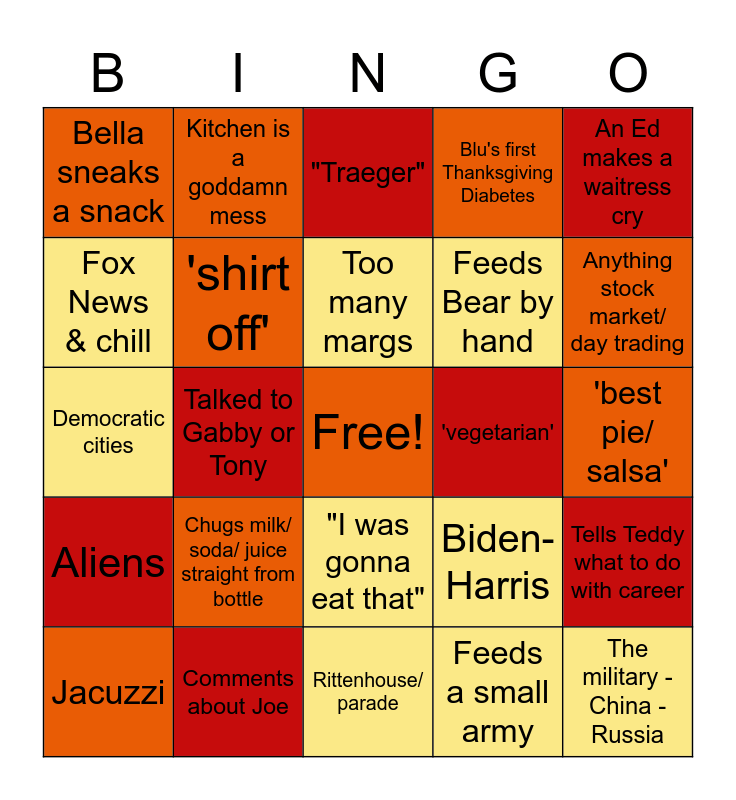 This bingo card has a free space and 24 words: Chugs milk/ soda/ juice straight from bottle, Comments about Joe, Too many margs, Jacuzzi, An Ed makes a waitress cry, Bella sneaks a snack, Fox News & chill, Kitchen is a goddamn mess, 'vegetarian', "I was gonna eat that", Feeds Bear by hand, Democratic cities, Biden- Harris, Tells Teddy what to do with career, 'shirt off', Feeds a small army, 'best pie/ salsa', "Traeger", Anything stock market/ day trading, Talked to Gabby or Tony, The military - China - Russia, Aliens, Blu's first Thanksgiving Diabetes and Rittenhouse/ parade.