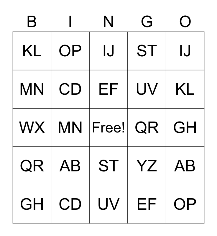 This bingo card has a free space and 24 words: AB, CD, EF, GH, IJ, KL, MN, OP, QR, ST, UV, WX, YZ, AB, CD, EF, GH, IJ, KL, MN, OP, QR, ST and UV.