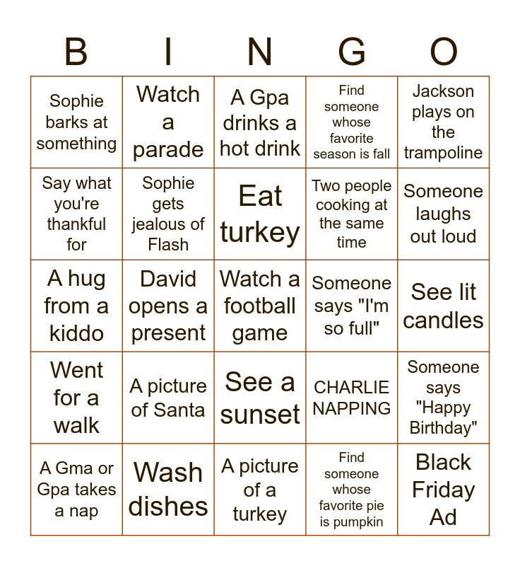 This bingo card has 25 words: A picture of Santa, A picture of a turkey, Eat turkey, A Gma or Gpa takes a nap, Jackson plays on the trampoline, Sophie barks at something, Say what you're thankful for, Watch a parade, Someone says "I'm so full", See a sunset, Two people cooking at the same time, A hug from a kiddo, CHARLIE NAPPING, Someone says "Happy Birthday", Sophie gets jealous of Flash, Black Friday Ad, See lit candles, A Gpa drinks a hot drink, Someone laughs out loud, David opens a present, Watch a football game, Wash dishes, Went for a walk, Find someone whose favorite season is fall and Find someone whose favorite pie is pumpkin.
