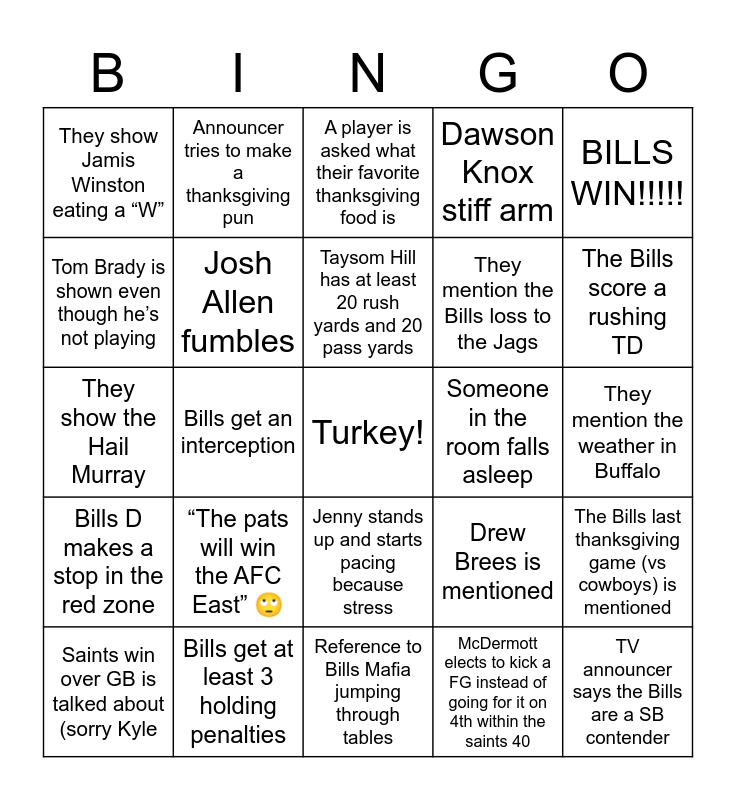 This bingo card has a free space and 24 words: “The pats will win the AFC East” 🙄, Bills get at least 3 holding penalties, Taysom Hill has at least 20 rush yards and 20 pass yards, Saints win over GB is talked about (sorry Kyle, BILLS WIN!!!!!, They show Jamis Winston eating a “W”, Tom Brady is shown even though he’s not playing, Announcer tries to make a thanksgiving pun, Someone in the room falls asleep, Jenny stands up and starts pacing because stress, They mention the Bills loss to the Jags, They show the Hail Murray, Drew Brees is mentioned, The Bills last thanksgiving game (vs cowboys) is mentioned, Josh Allen fumbles, McDermott elects to kick a FG instead of going for it on 4th within the saints 40, They mention the weather in Buffalo, A player is asked what their favorite thanksgiving food is, The Bills score a rushing TD, Bills get an interception, TV announcer says the Bills are a SB contender, Bills D makes a stop in the red zone, Dawson Knox stiff arm and Reference to Bills Mafia jumping through tables.