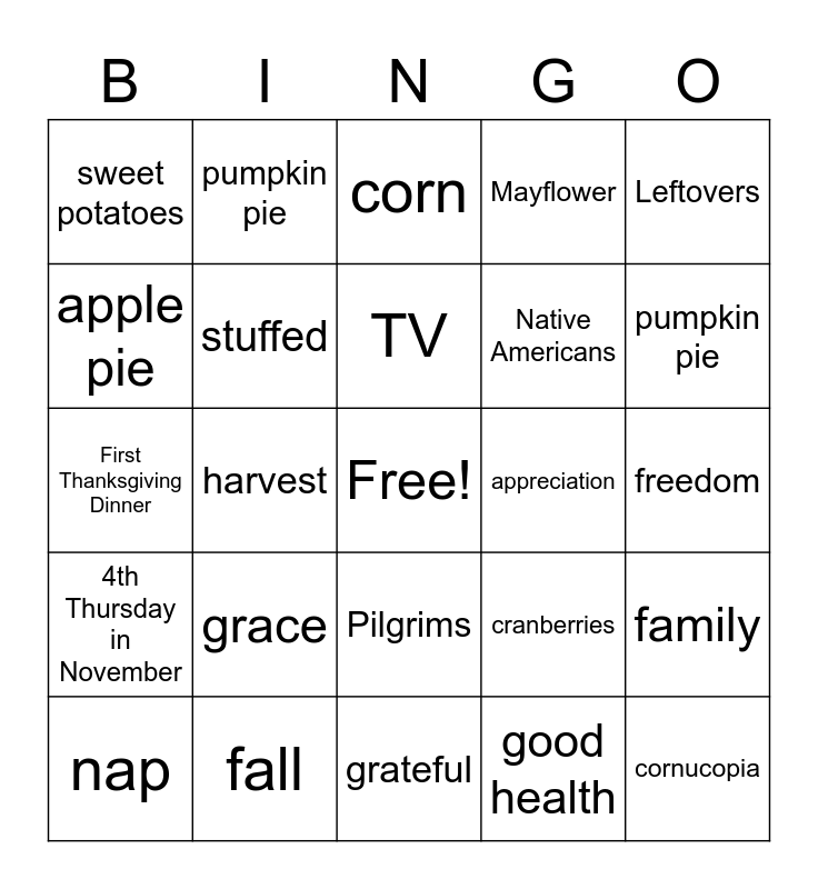 This bingo card has a free space and 24 words: grace, fall, TV, nap, Leftovers, sweet potatoes, apple pie, pumpkin pie, appreciation, Pilgrims, Native Americans, First Thanksgiving Dinner, cranberries, family, stuffed, good health, freedom, corn, pumpkin pie, harvest, cornucopia, 4th Thursday in November, Mayflower and grateful.
